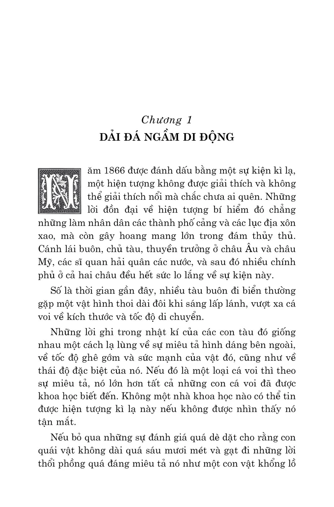 Trong chuyến săn tìm một sinh vật lạ lùng mới xuất hiện ở biển khơi, đoàn thám hiểm của giáo sư Pierre Aronnax bất ngờ bị “con cá” khổng lồ đó nuốt vào bụng. Nhưng cũng nhờ thế, họ đã được chu du khắp các đại dương cùng thuyền trưởng Nemo trong chiếc tàu ngầm Nautilus. Những phát minh kì lạ, những cuộc chạm trán hiểm nguy, những bí mật li kì... tất cả đã tạo nên một chuyến phiêu lưu vô cùng thú vị.