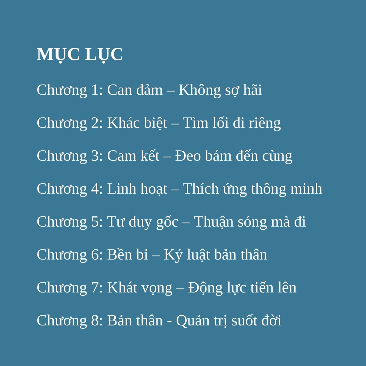 Cuốn sách gồm 8 chương tương ứng với 8 phẩm chất, năng lực cốt lõi, dẫn dắt một con người trưởng thành từ bên trong, theo hành trình: Sợ hãi → Vững vàng → Tự chủ → Trưởng thành. Mỗi chương được viết từ những câu chuyện thật điển hình để từ đó rút ra bài học bài học thiết thực, hữu ích, cùng những gợi ý thực hành giúp bạn hiểu mình hơn, giữ vững trục giá trị và dám mơ – dám đi để biến những điều “không tưởng” ban đầu trở thành khả dĩ.