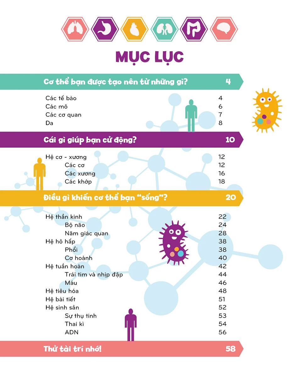 Bạn sẽ có cơ hội tìm hiểu từ tế bào – đơn vị cấu tạo cơ bản để tạo nên sự sống, các mô, các cơ quan đến da. Và bạn chắc chắn sẽ vô cùng ngạc nhiên khi biết rằng trong cơ thể chúng ta có hơn 200 chiếc xương, khoảng 600 cơ, 1 trái tim, 2 lá phổi, gần 30 lít nước, 5 lít máu và hàng tỉ tế bào đang làm việc không ngừng nghỉ mỗi ngày. Tất cả tạo nên một cỗ máy kì diệu giúp bạn cử động, thở, suy nghĩ và cảm nhận thế giới.