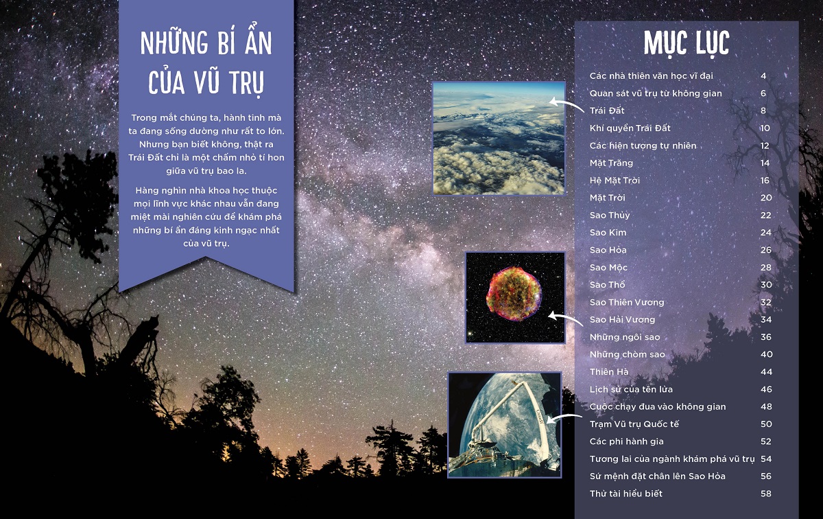 Ngoài ra, những hình ảnh ấn tượng và sự thật đáng kinh ngạc về các hành tinh trong Hệ Mặt Trời, những ngôi sao và thiên hà cũng sẽ được tiết lộ tới bạn đọc trong Khám phá vũ trụ. Không chỉ vậy, cuốn sách còn giới thiệu hành trình chinh phục vũ trụ từ những nhà thiên văn học cổ đại đến các công nghệ hiện đại được áp dụng ngày nay, cũng như các sứ mệnh khám phá vũ trụ trong tương lai.