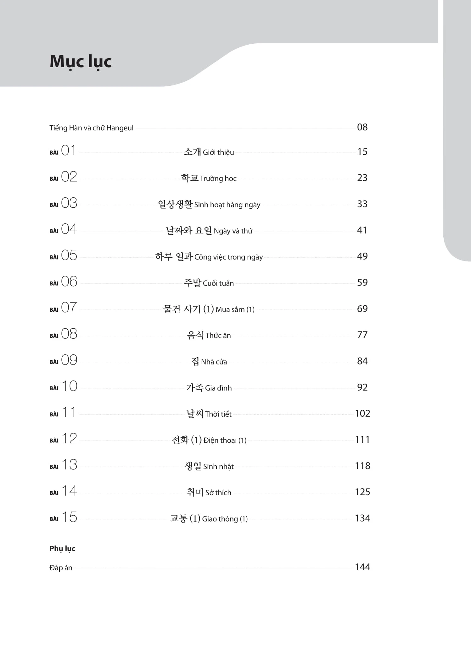 Sách bài tập sơ cấp 1 – bổ trợ cho Giáo trình tiếng Hàn tổng hợp được chia thành 3 phần chính sau đây: