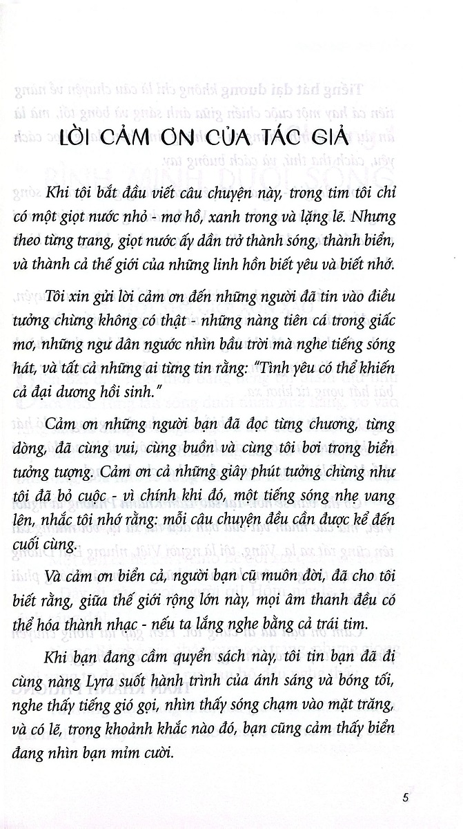 Cuốn sách dẫn người đọc đi qua kí ức, mất mát và hi vọng. Ở đó có Lyna – tiếng hát không tắt dù mang trong mình nỗi đau; có John – con gió chọn yêu bằng cách rời đi; và có đại dương – trái tim mênh mông lớn cất giữ mọi điều kì diệu. Đây không chỉ là câu chuyện về một nàng tiên cá mà là ẩn dụ dịu dàng về con người, về những linh hồn đang học cách lắng nghe và buông tay.