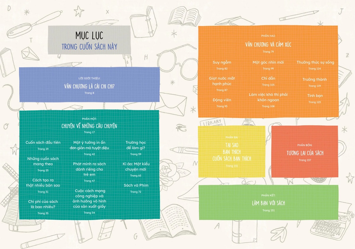Với giọng văn lôi cuốn và vui tươi, Trường Học Cuộc Đời - Ý Tưởng Thông Thái Đến Từ Văn Chương dẫn dắt bạn đọc khám phá dòng chảy lịch sử của những câu chuyện, quá trình văn học tác động đến cảm xúc, suy nghĩ của chúng ta và tìm hiểu về một số cuốn sách hấp dẫn từ khắp nơi trên thế giới mà chúng ta có thể yêu thích.